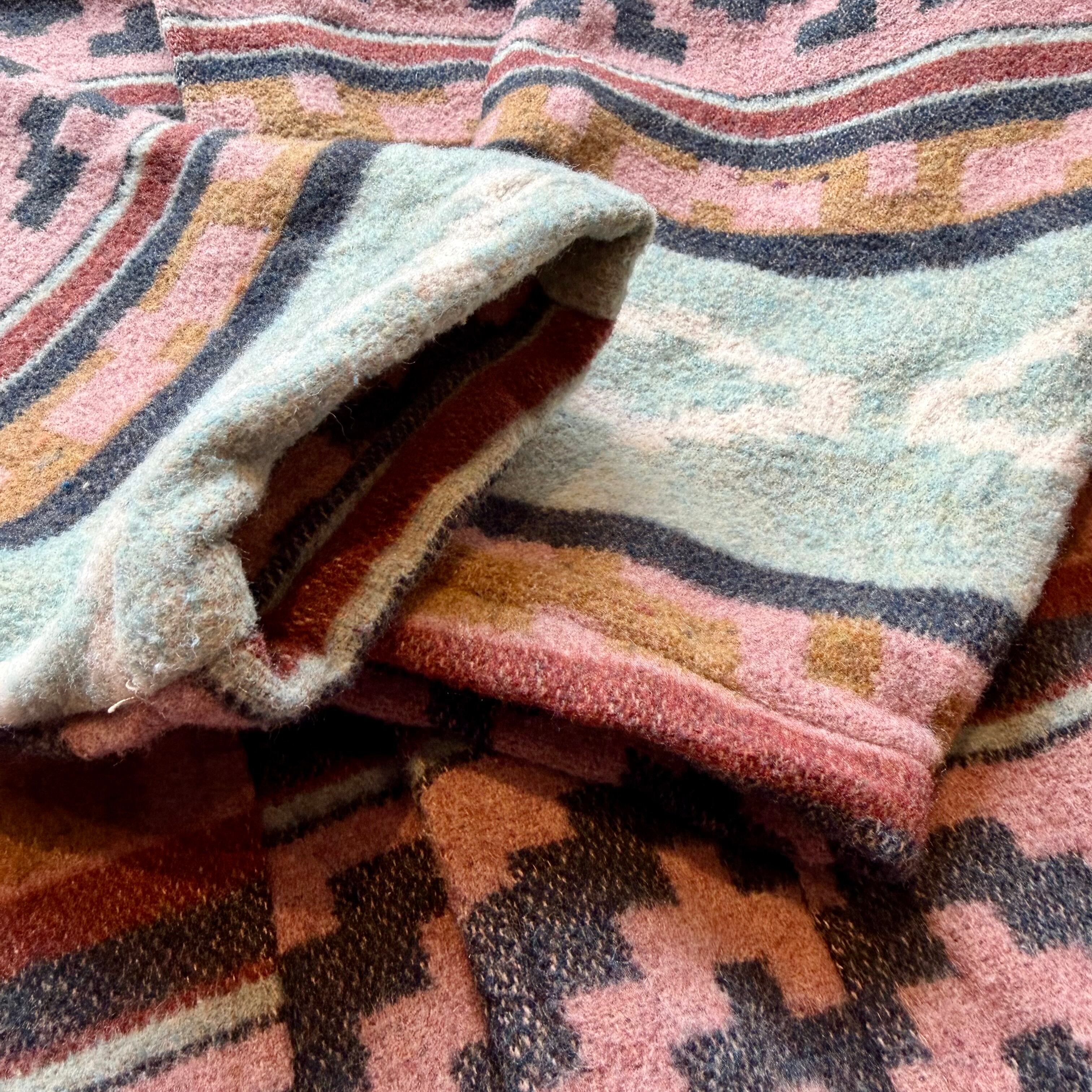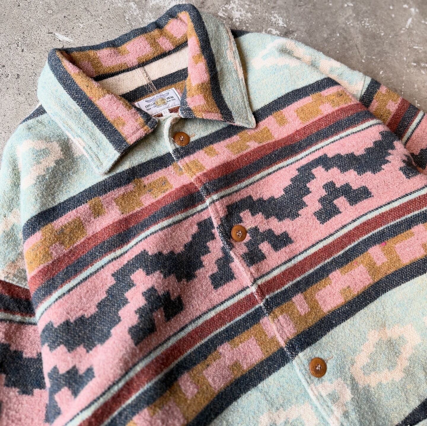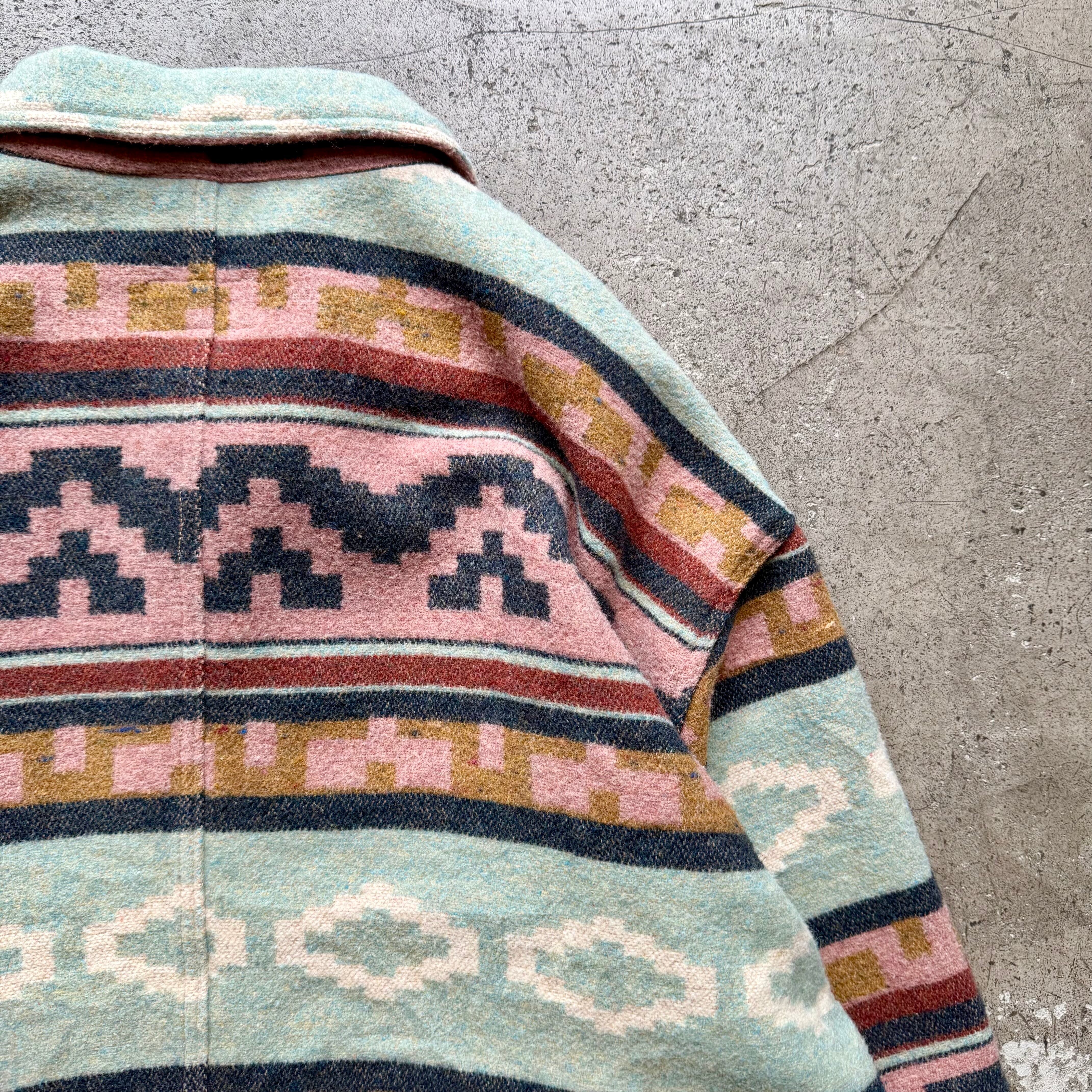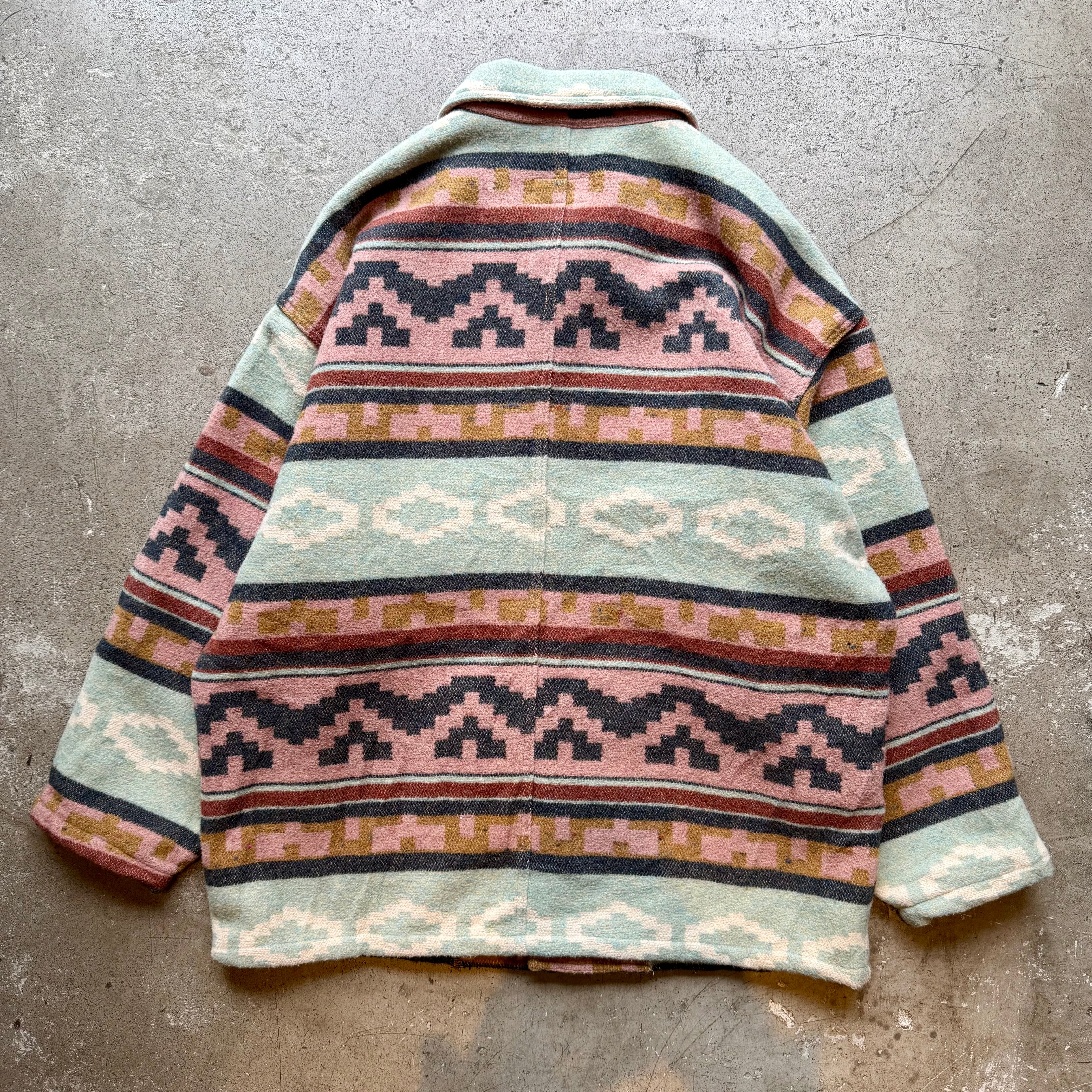 90年代らしい配色が印象的なネイティブ柄ウールジャケット。ミントグリーンをベースにピンクやブラウンを効かせた配色は同系統の中でも存在感があり、スタイリングの主役として活躍します。身幅・肩幅ともにゆとりのあるXLサイズでインナーを選ばずアウター感覚で着用可能。ブランドに依存せず、純粋に柄とサイズ感で選べる一着です。