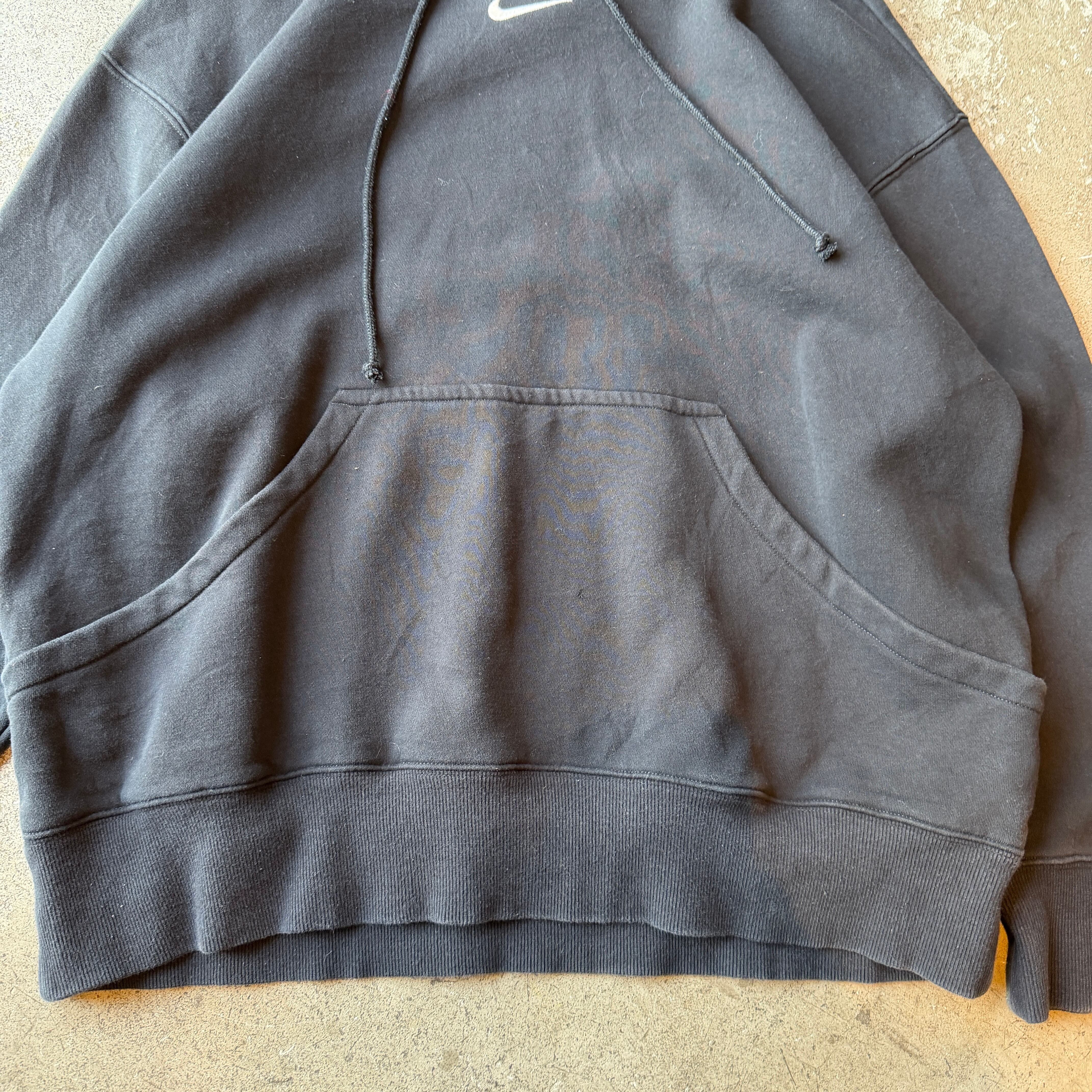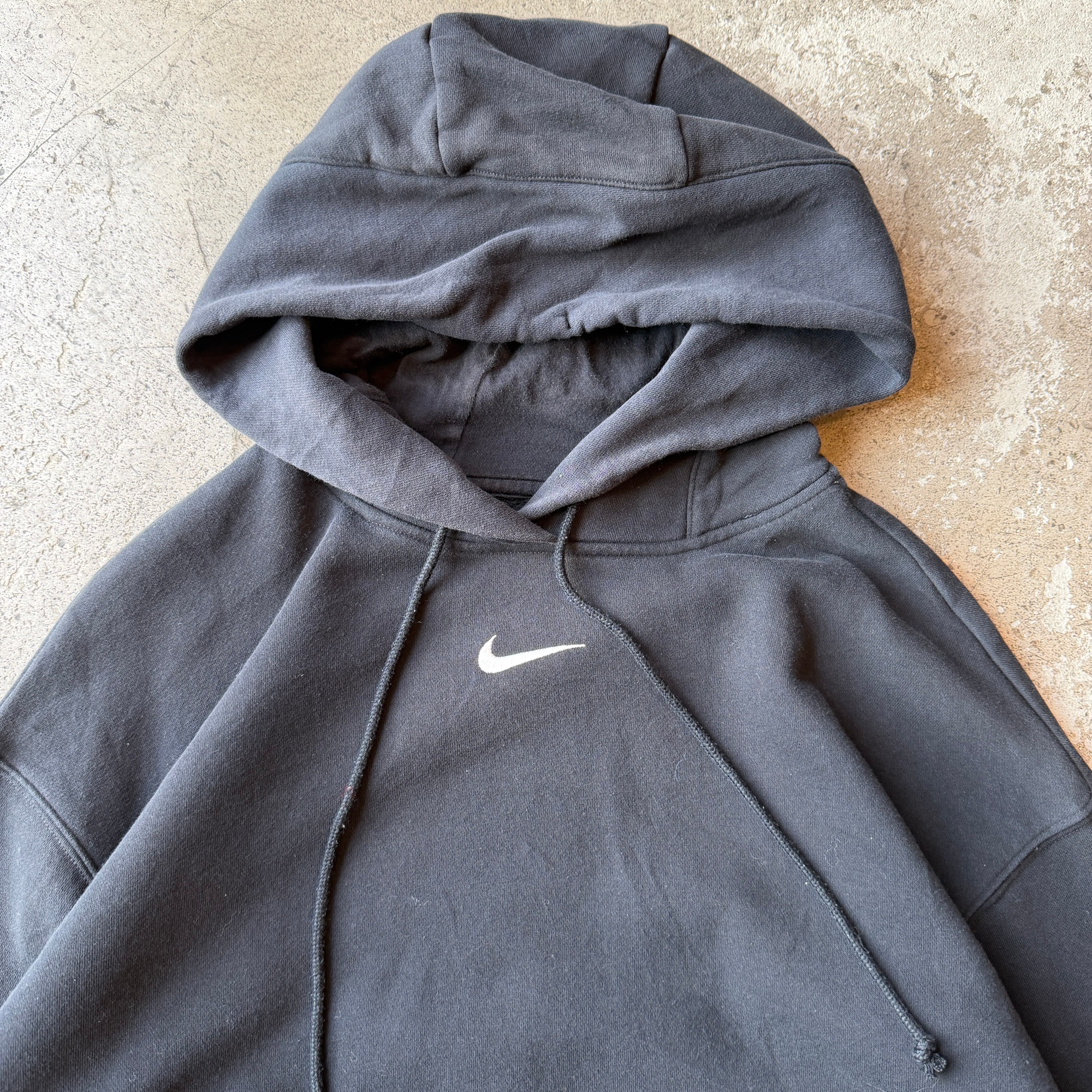 どんなスタイルにも溶け込む、完成度の高いブラックのNIKEプルオーバーパーカー。センタースウォッシュのみを配したミニマルなデザインは主張しすぎず着こなしの軸として機能します。