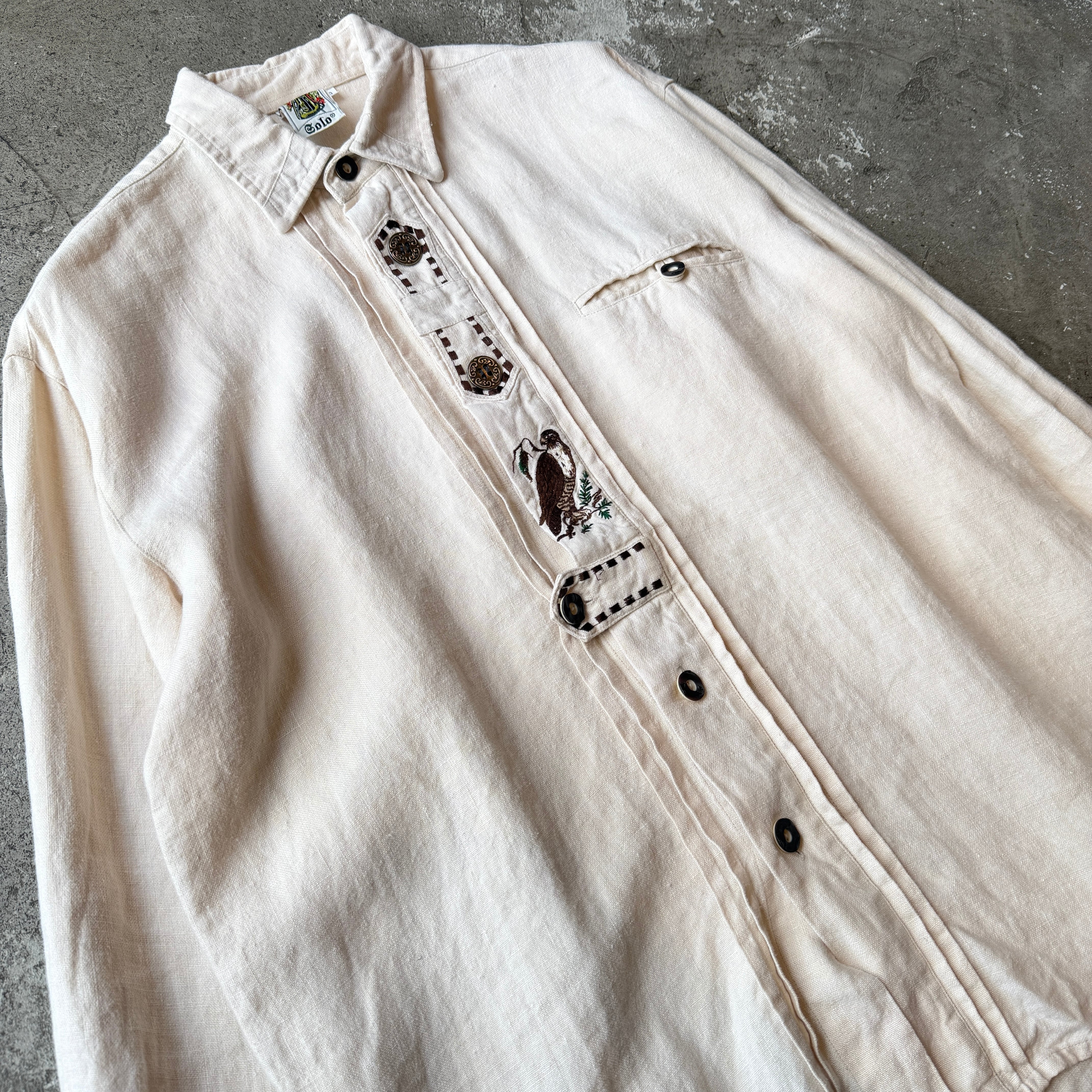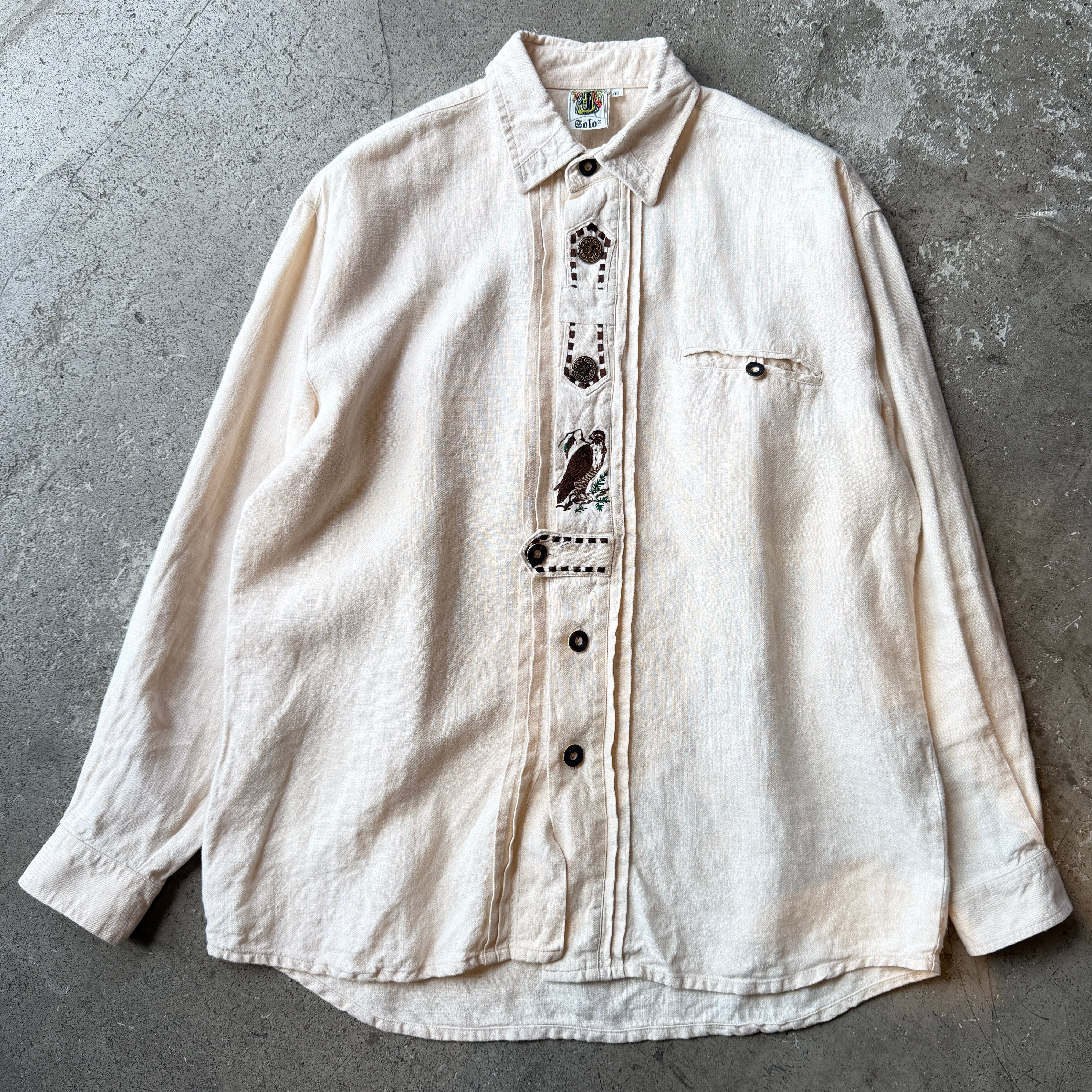 アルプス山脈、チロル地方の民族衣装であるチロリアンシャツ。前立てに施された鳥の刺繍や鹿の角でできたボタン、メダルボタンなど、素朴さと装飾性を併せ持つディテールが特徴です。
