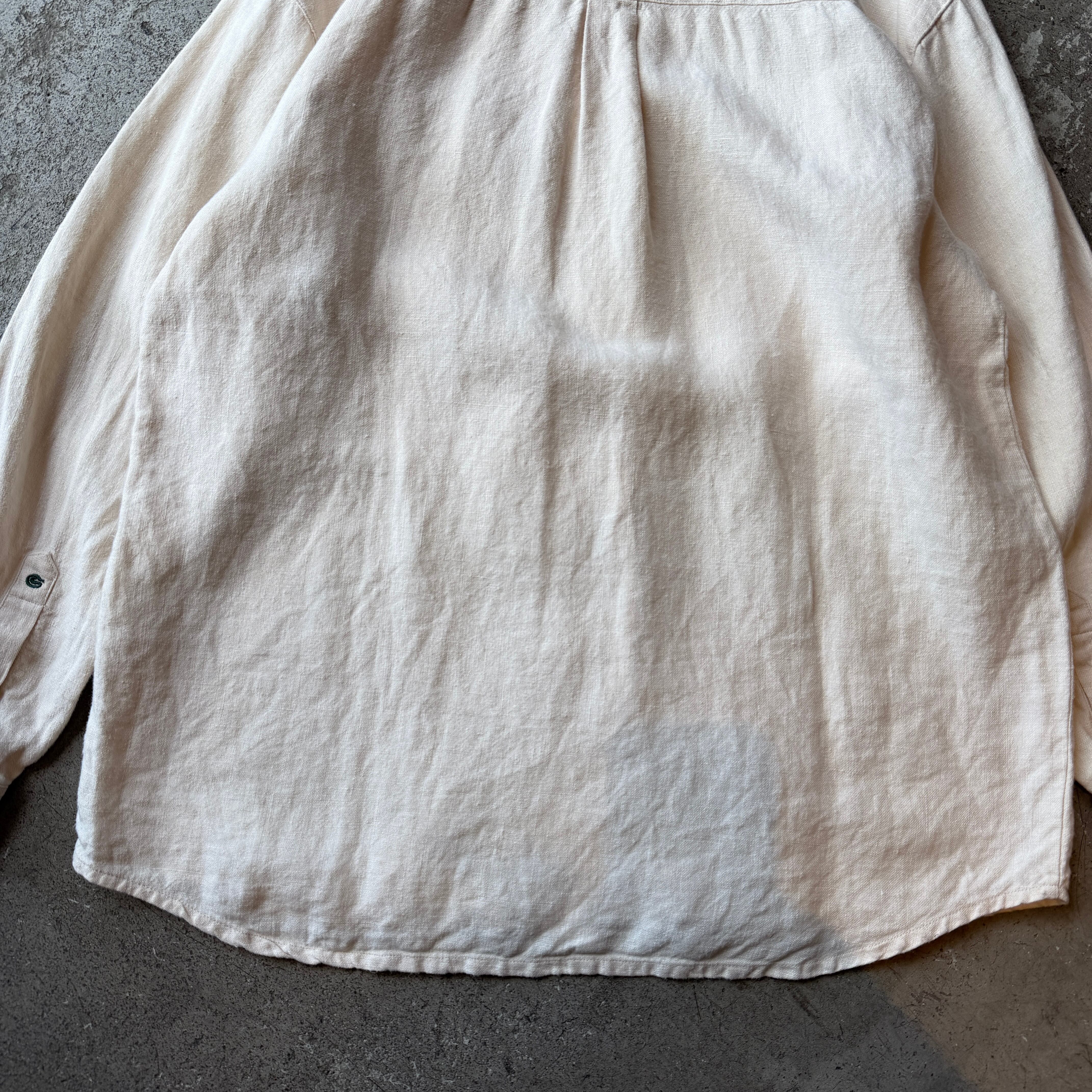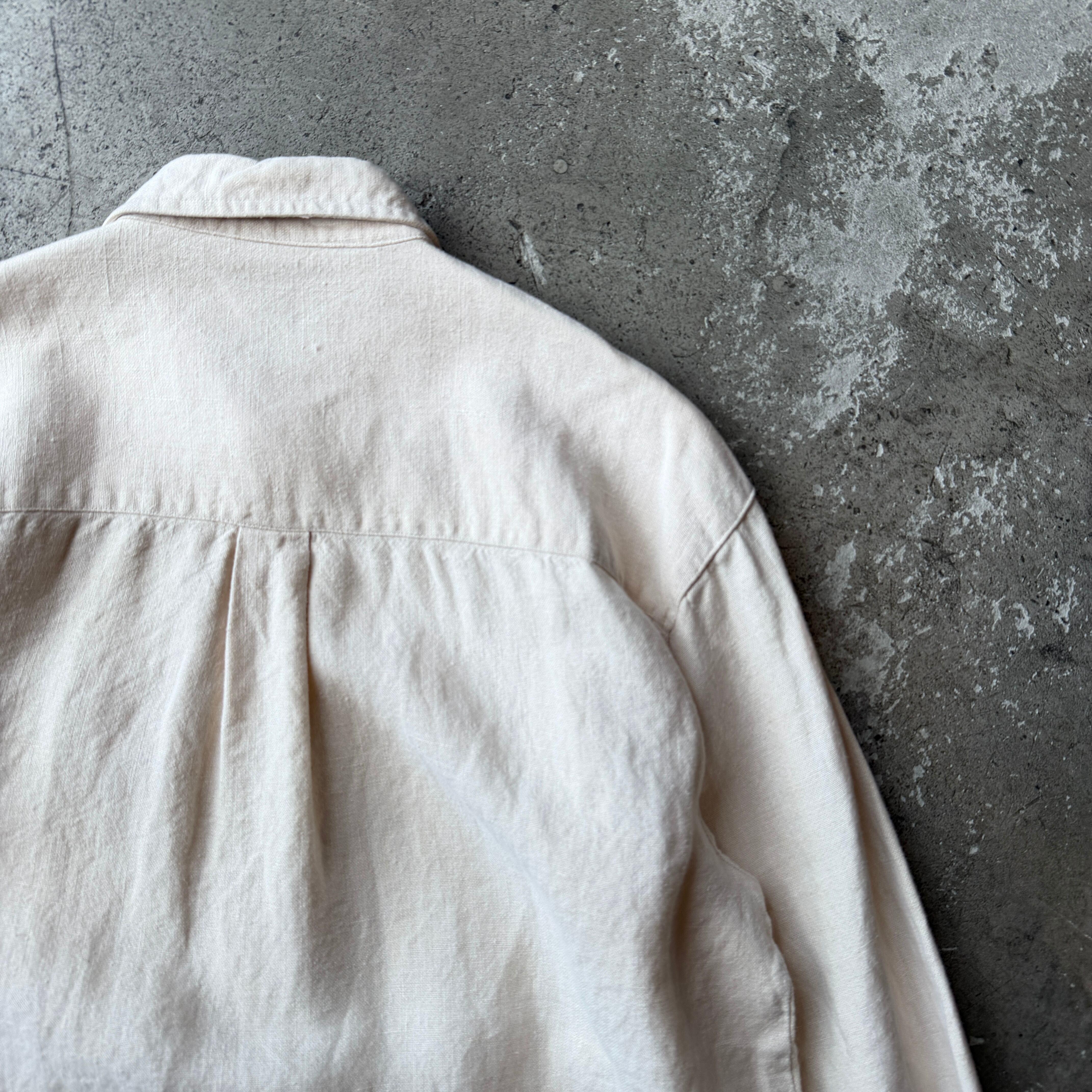 生成りのリネン素材に経年変化が重なり、クラフト感と一点モノ的な存在感を楽しめる一着。