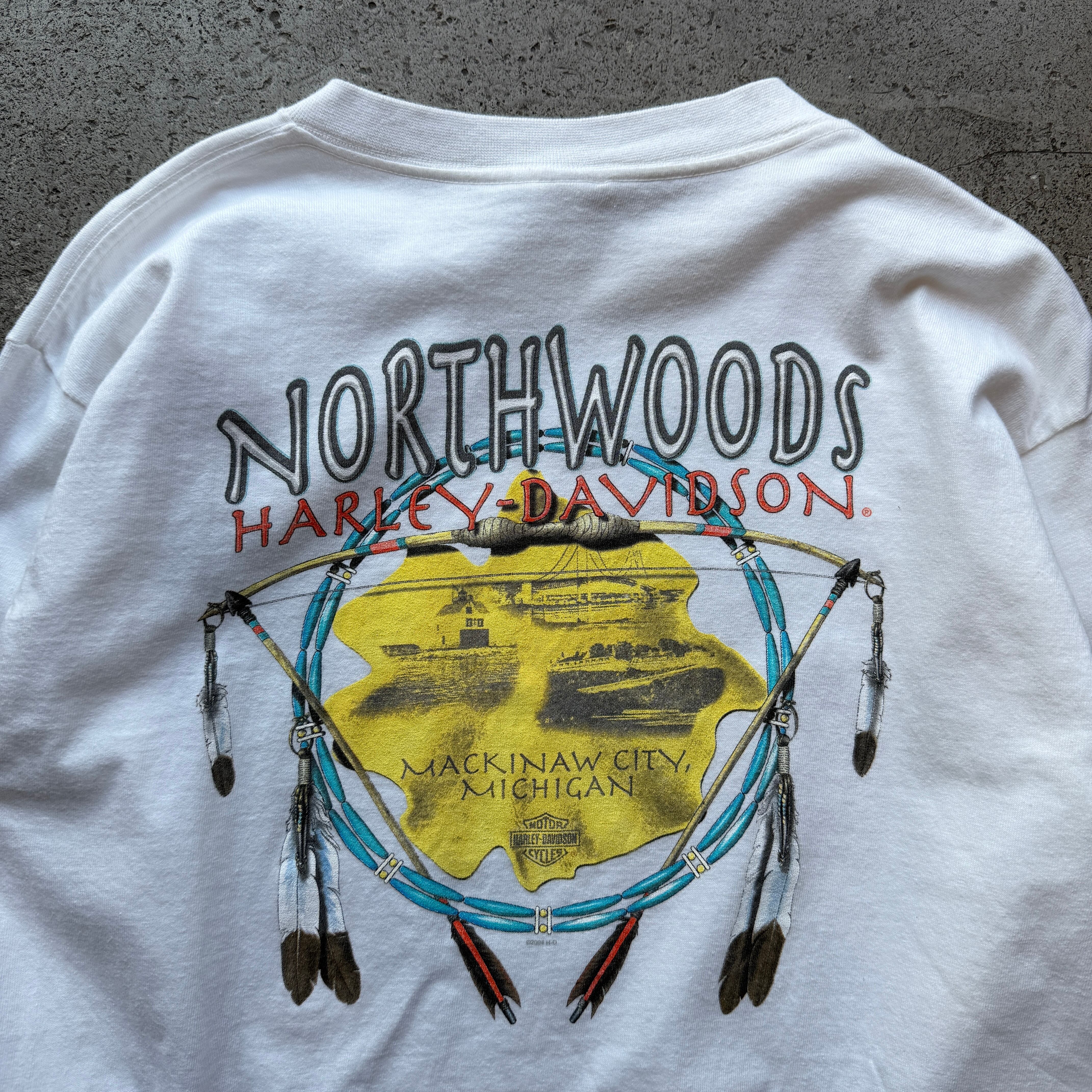 フロントにクラシックなバー&シールドロゴ、バックには“Northwoods HARLEY-DAVIDSON / Mackinaw City, Michigan”のロケーションプリントを配した一着。