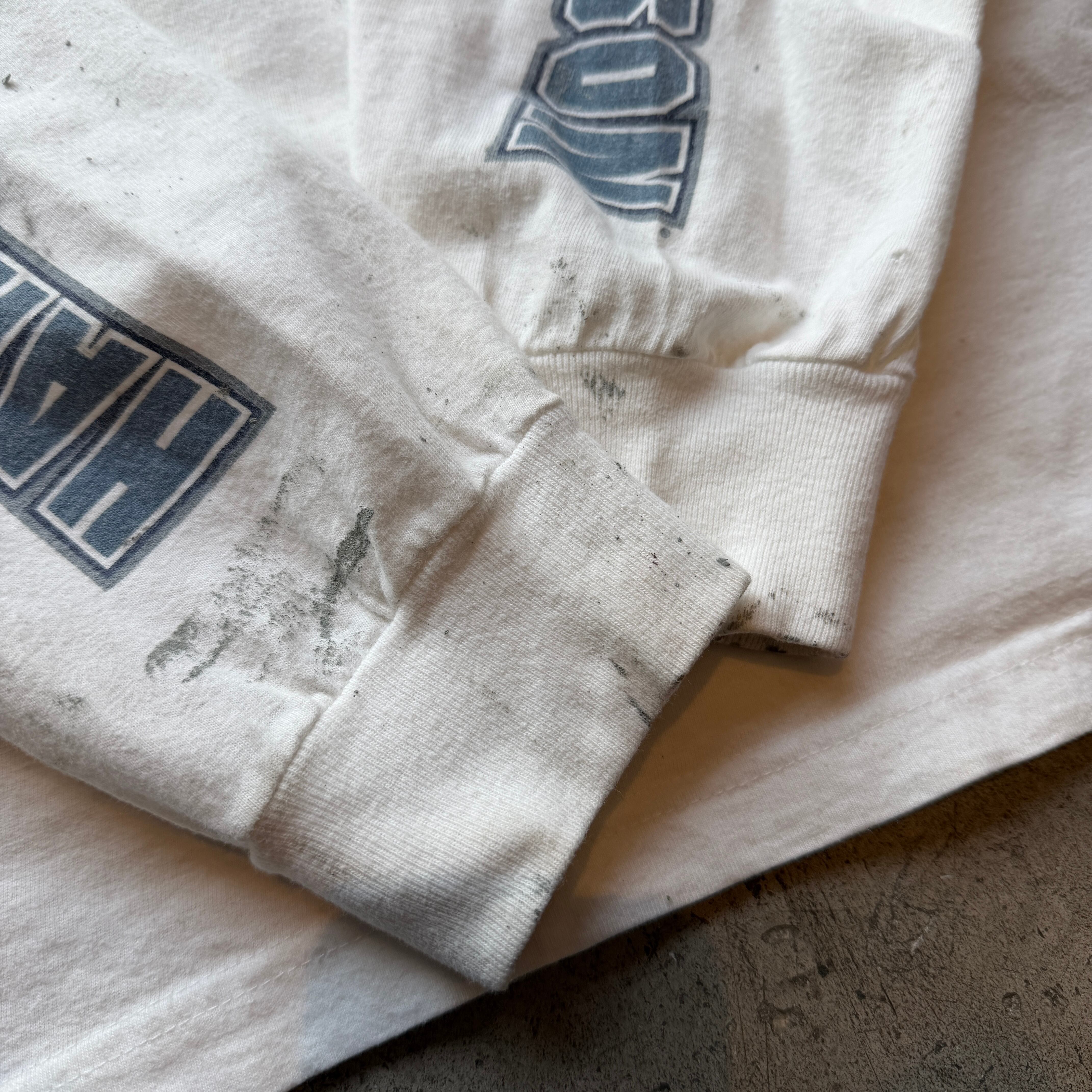 着込まれたホワイトボディとリアルな汚れ感が相まい、プリントTシャツでは出せない無骨な存在感を放つ一着です。