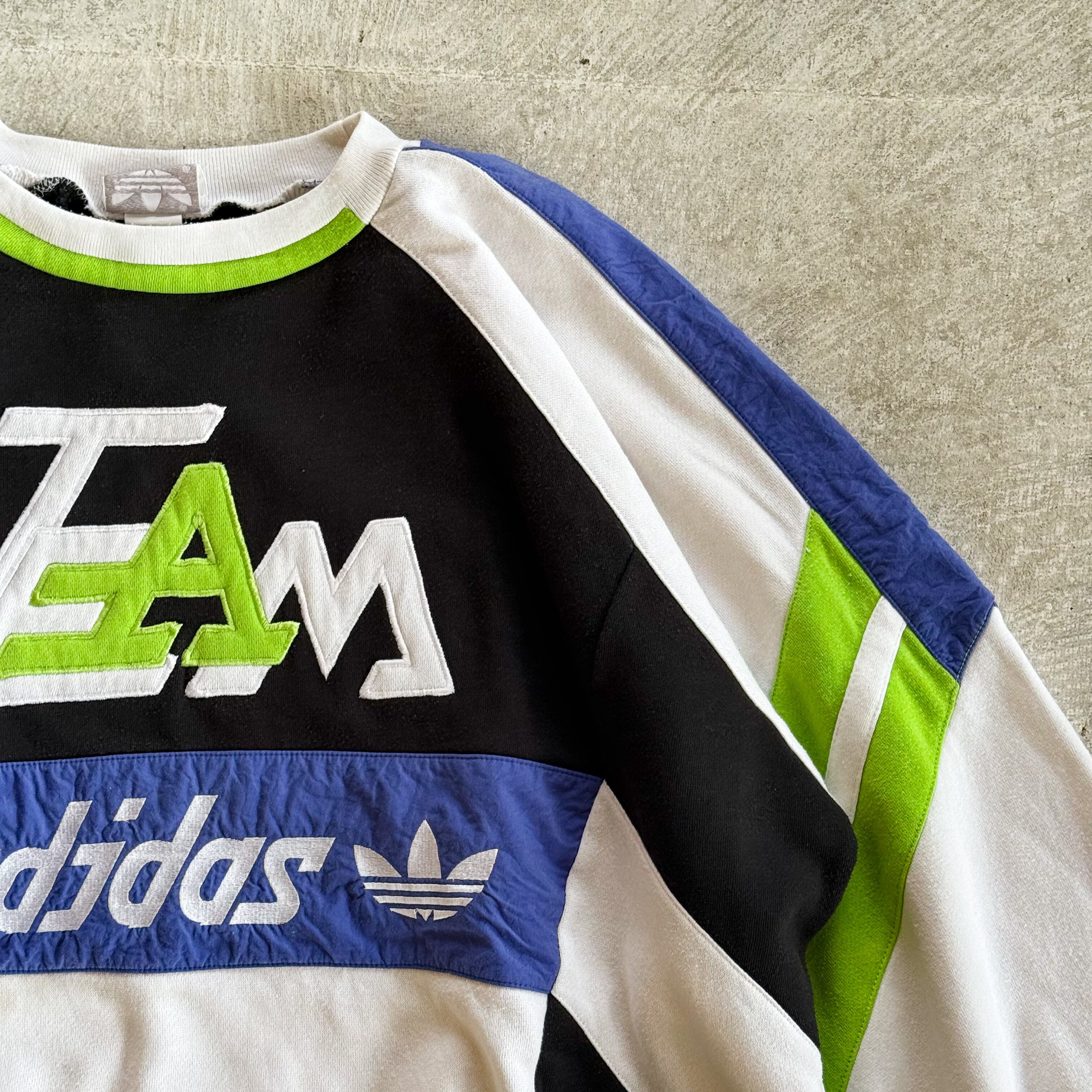 フロントに「TEAM」ロゴ刺繍とトレフォイルロゴを配置した、配色切り替えデザインが特徴のadidasスウェットシャツです。