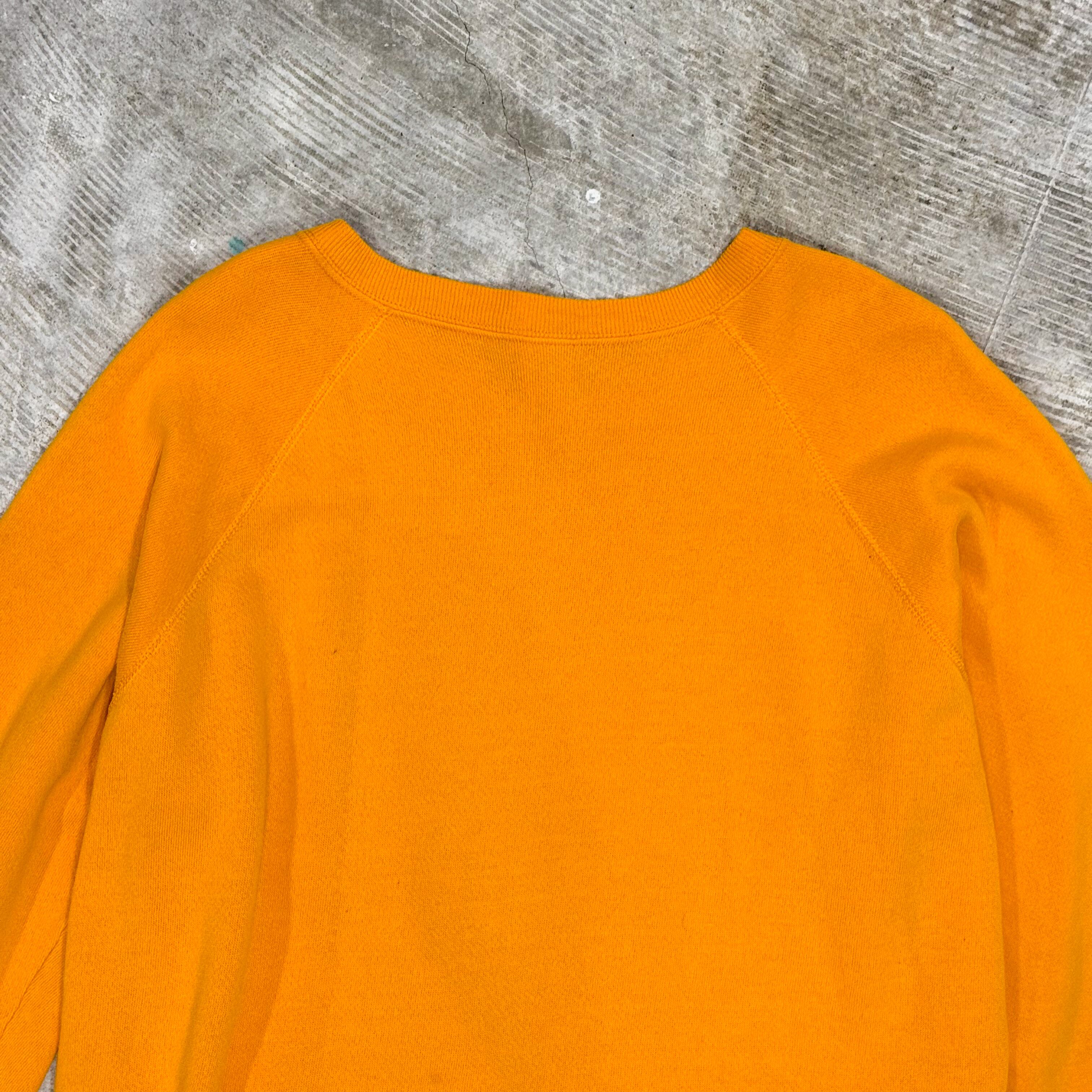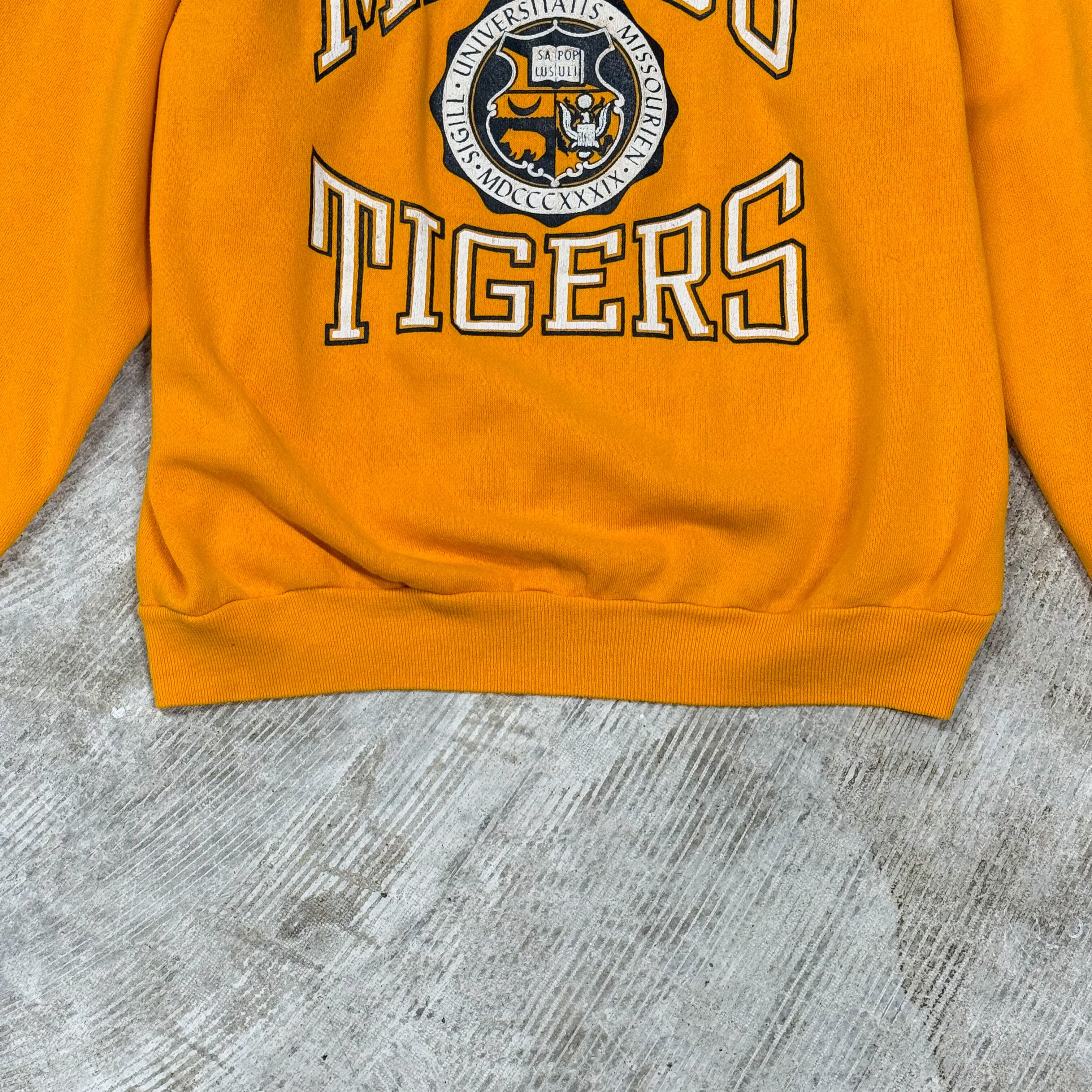 「MIZZOU(ミズー)」はミズーリ大学(University of Missouri)の愛称で、1839年創立・ミシシッピ川以西で最初の公立大学として知られる歴史ある名門校のカレッジロゴです。TIGERS(タイガース)の呼び名は南北戦争期に地元コロンビアを守ったホームガードの通称がルーツとされ、背景込みで“語れる”のがこの手のカレッジ物の魅力になっています。ボディはARTEX(JOSTENS)製のアクリル×コットン(50/50)で、裏起毛の軽さと暖かさのバランスが良く、春先はアウターの中にも入れやすい厚みです。フロントのカレッジロゴとエンブレムプリントが主役になるので、デニムやチノで王道にまとめても、ナイロンパンツで外しても雰囲気が出ます。さらに「M-I-Z!」→「Z-O-U!」のコール&レスポンス文化も有名で、着るだけで会話が生まれる“カレッジスウェットらしさ”を楽しめる一枚です。