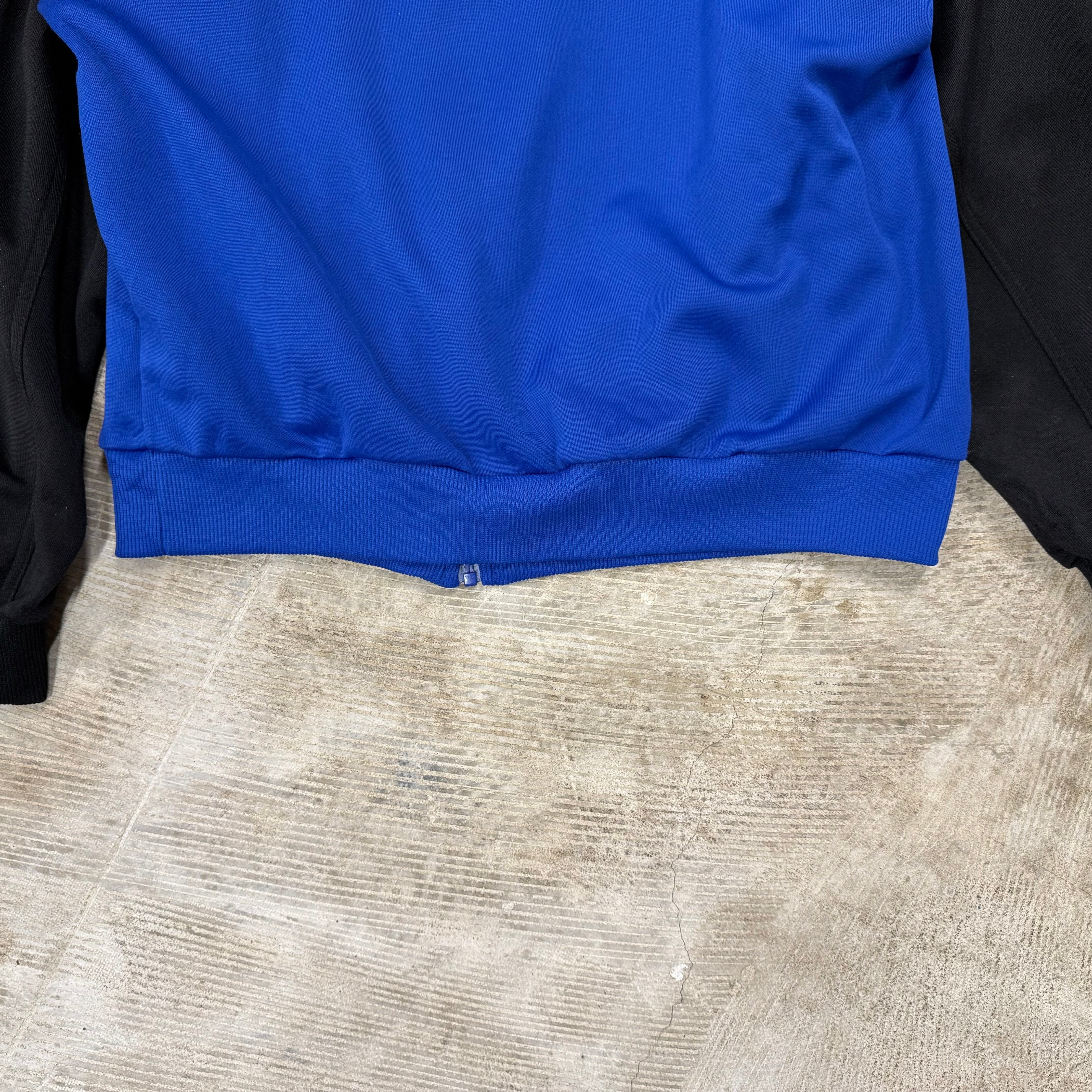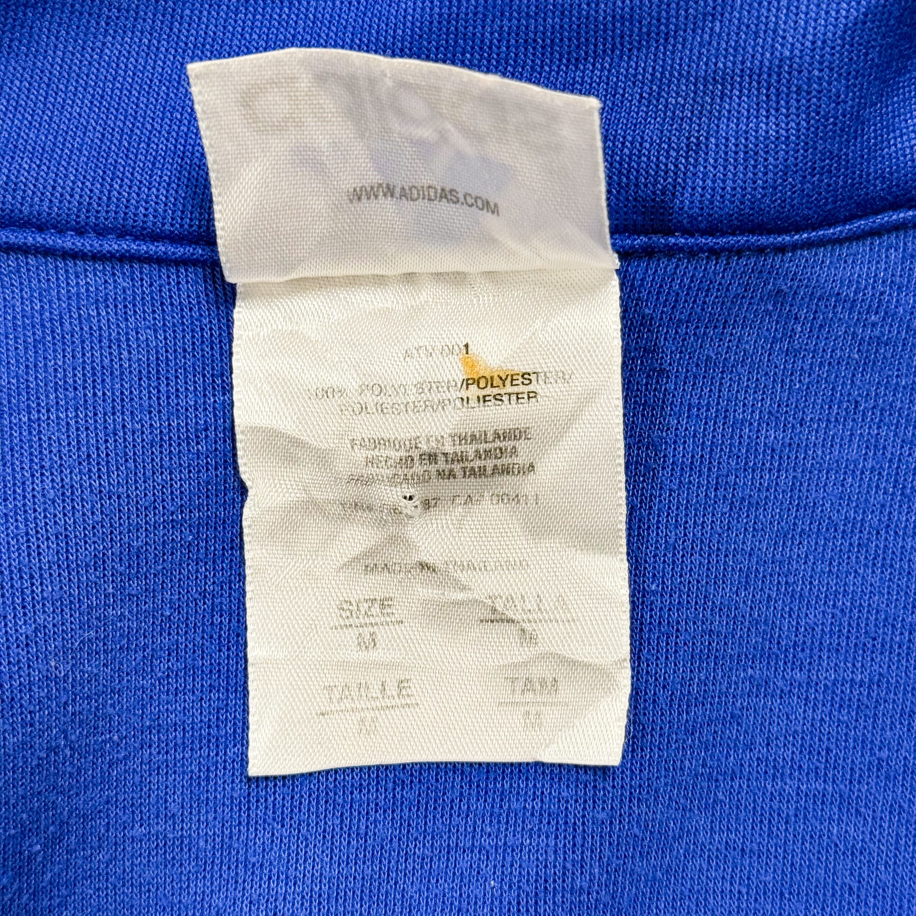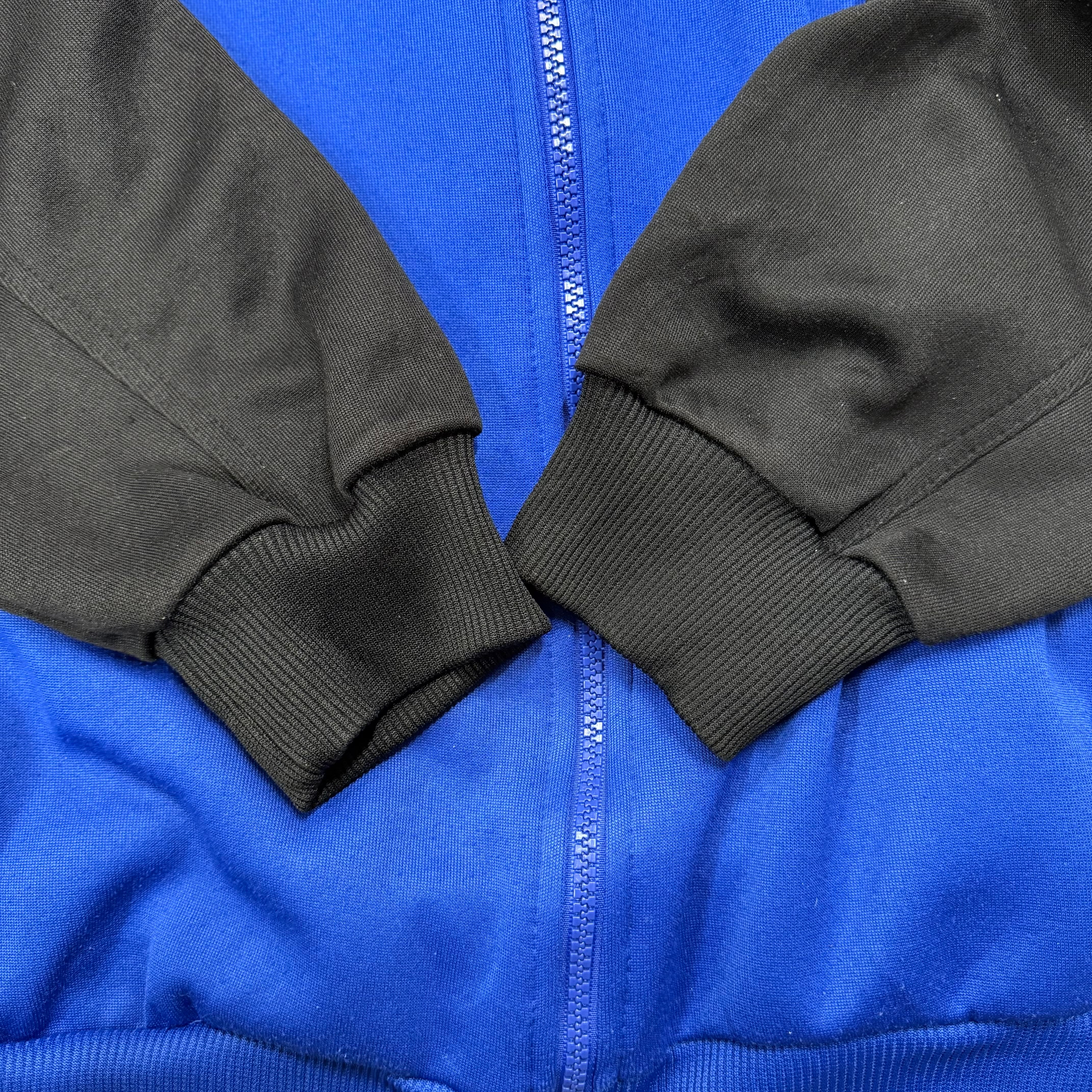 adidasのジップアップトラックジャケットです。胸元の「CLARKSVILLE SOCCER」プリントは、アメリカの地域サッカークラブ/コミュニティ由来のチームウェア感が魅力で、市販のスポーツロゴ物より被りにくいのがポイント。ブルー×ブラックにホワイトラインの王道配色で合わせやすく、デニムやワイドパンツに羽織るだけでスポーツMIXが完成します。