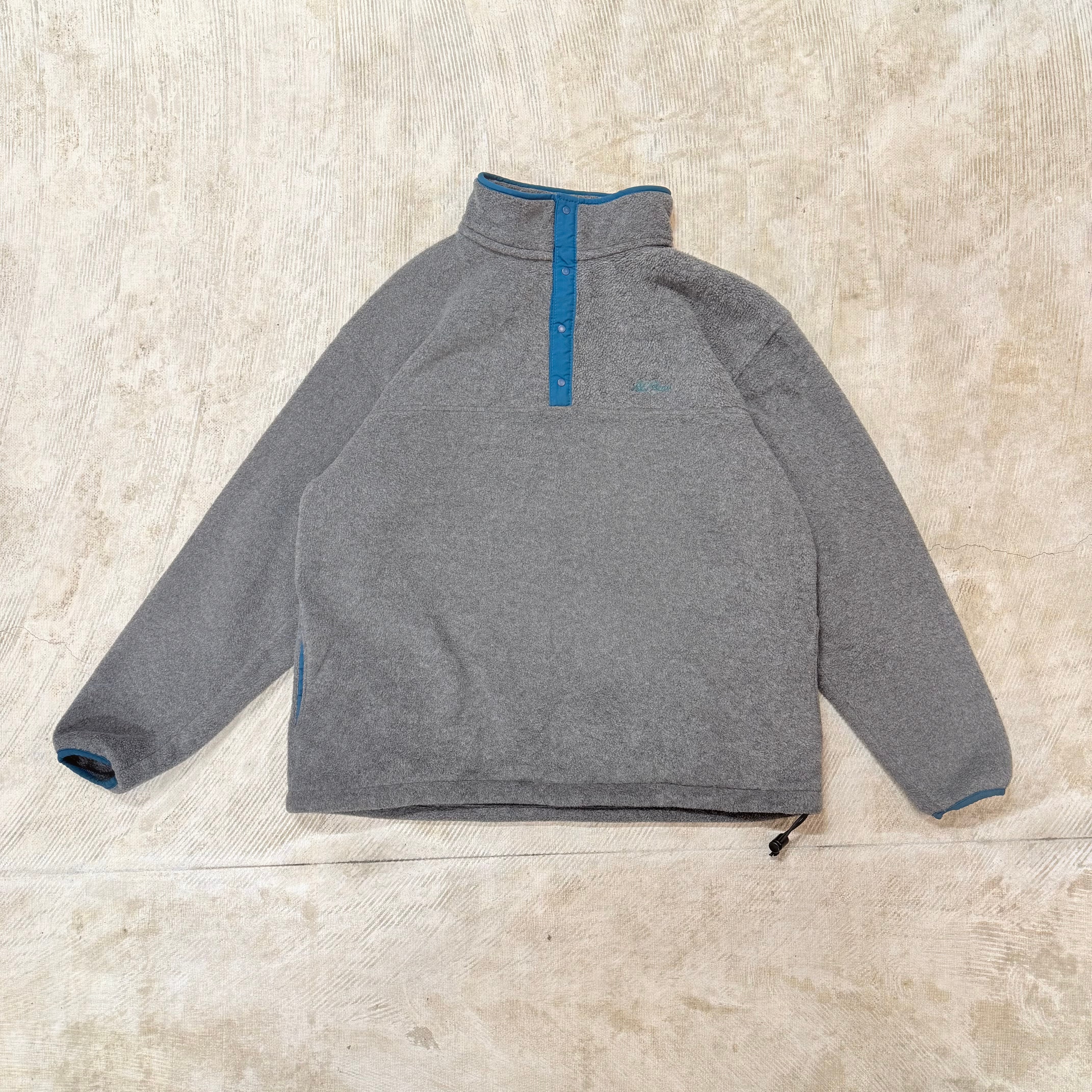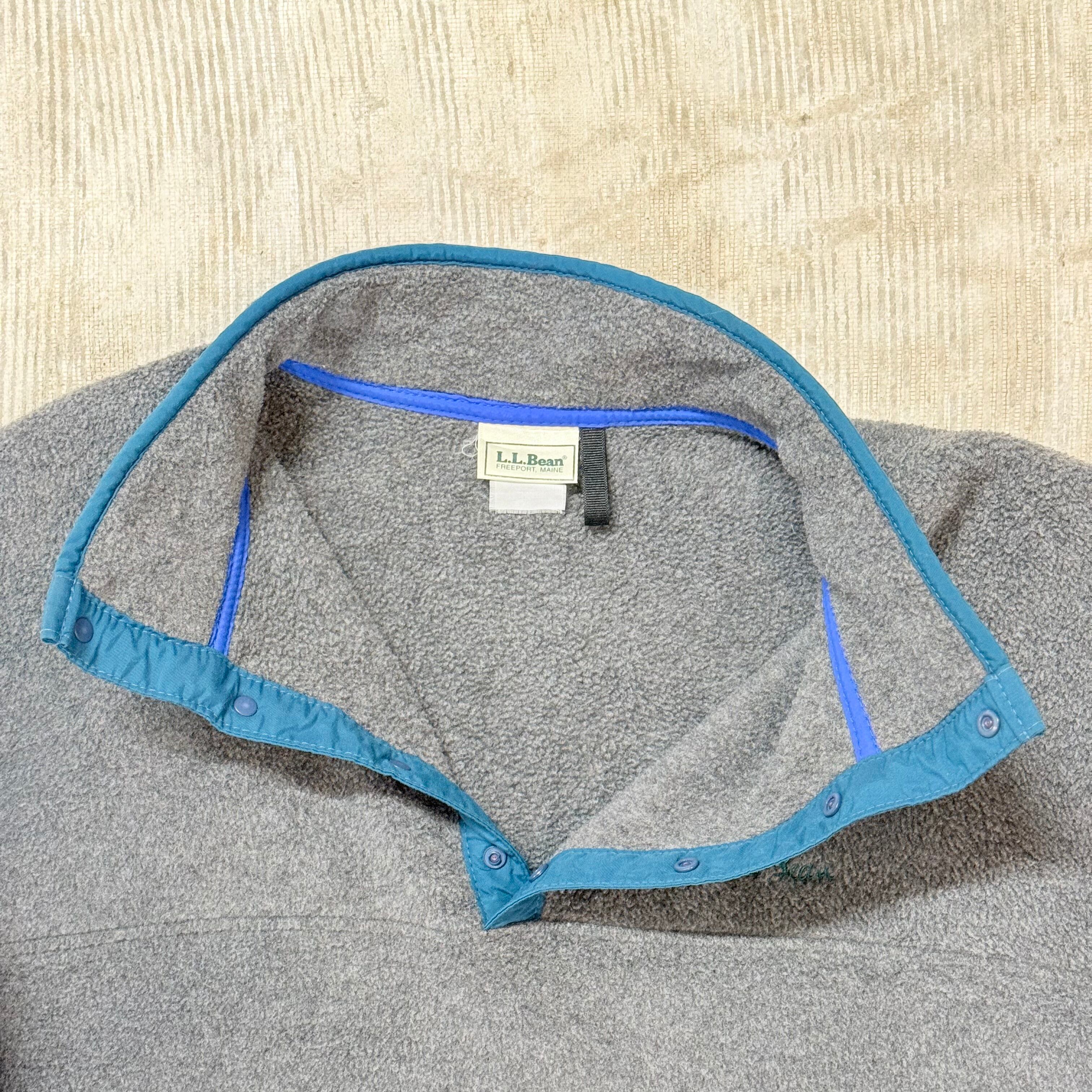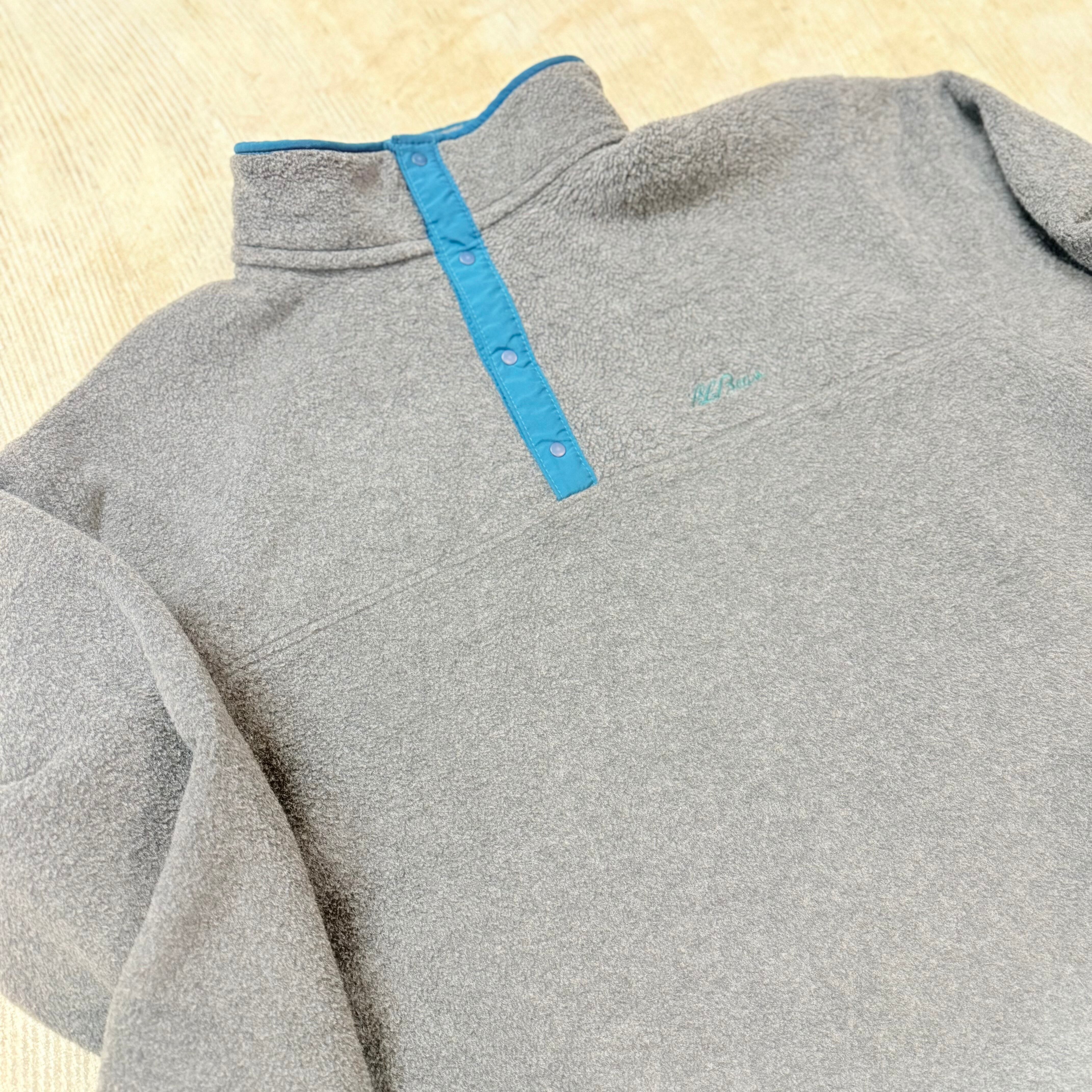 ハーフスナップ仕様のL.L.Beanフリースプルオーバーです。前立てと袖口にナイロン切替を施した90年代らしいデザインが特徴で、アウトドアテイストを程よく演出します。実寸はメンズL相当のサイズ感で、ワイドパンツやデニムと合わせたカジュアルスタイルにも適しています。